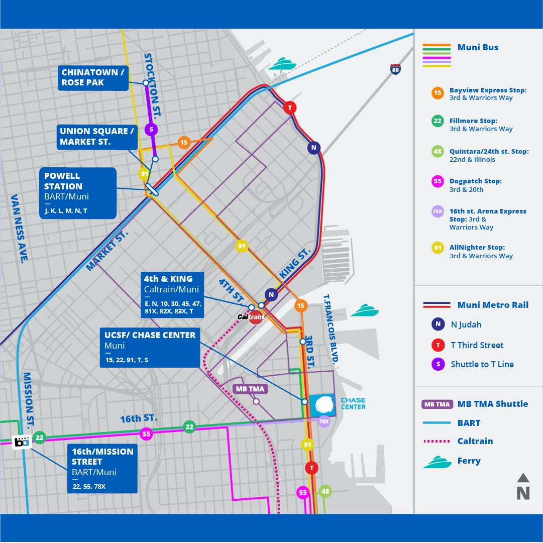 We strongly suggest that you leave early and plan your trip well in advance of the scheduled event at Chase Center. The use of public transportation is your best option to avoid traffic delays and road closures. As a reminder, your event ticket serves as your all-day FREE Muni ticket.