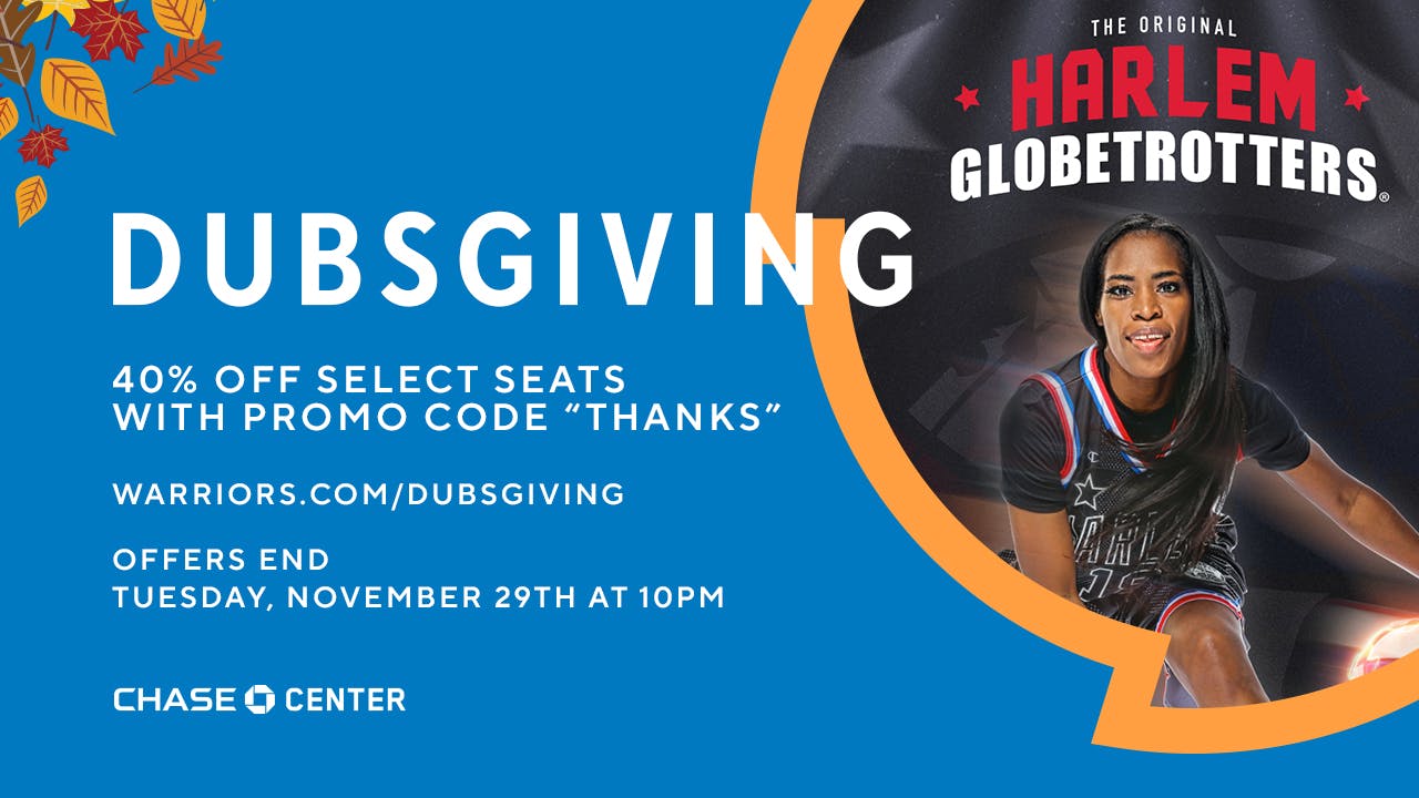 For select tickets only, purchase a primary ticket (i.e. a ticket labeled “Standard Ticket”) on Ticketmaster to the Harlem Globetrotters January 15, 2023 Chase Center event before 11/29/22 at 10PM using promo code THANKS and a forty percent (40%) discount shall be applied to the price of such ticket (the “Offer”). Offer does not apply to taxes or fees (including any Ticketmaster fees). While supplies last and subject to availability. Other restrictions/exclusions may apply.