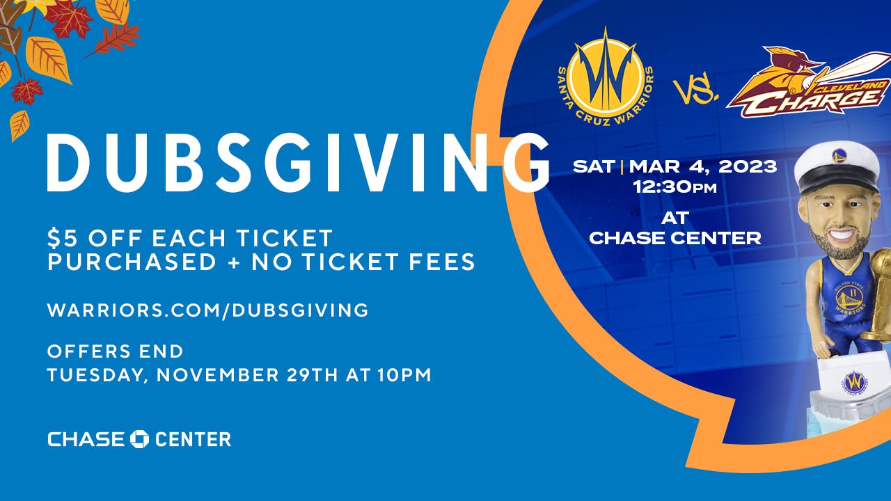From this Friday, Nov. 25, take advantage of can't-miss deals on select Chase Center events! For information on the Warriors' Dubsgiving offers on tickets, Warriors Shop and Warriors Basketball Academy, view here.