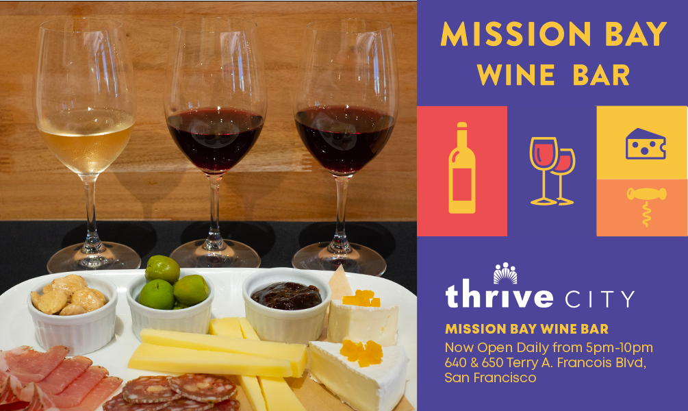 Mission Bay Wine Bar at Thrive City will be open daily from 5 – 10 p.m., with extended hours on Chase Center event nights. In the coming weeks, Mission Bay Wine Bar will open at 12 p.m. daily. The Thrive City location is an extension of its mothership, Mission Bay Wine & Cheese, located at 114 Channel Street in San Francisco.