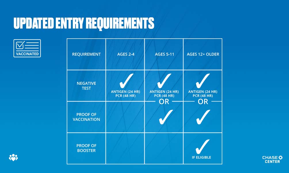 Fans are encouraged to visit chasecenter.com/fan-safety for information on venue entry polices for guests of all ages, arena health and hygiene protocols, and more. For booster shot eligibility and requirements, fans are asked to visit sf.gov/information/get-your-booster.